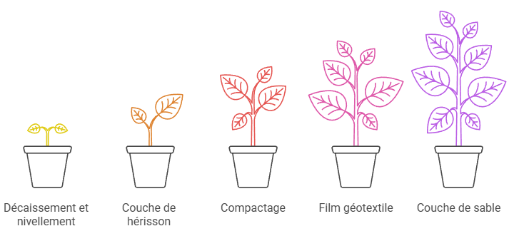 - Décaissement et nivellement du sol existant (10-15 cm minimum)